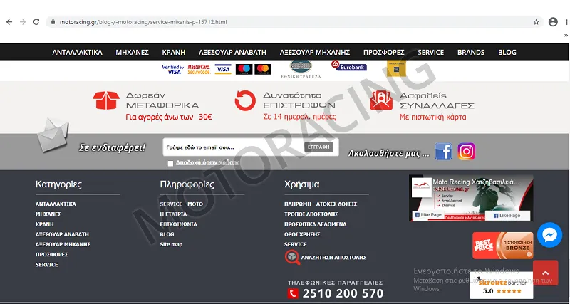 Παράλληλα, για να διαπιστώσετε και εσείς οι ίδιοι ότι το ηλεκτρονικό μας κατάστημα είναι απολύτως ασφαλές και αξιόπιστο, μπορείτε να ανατρέξετε στην μηχανή αναζήτησης της google, καθώς και μέσω της σελίδας μας στο Facebook και να διαβάσετε τα καθημερινά σχόλια που δεχόμαστε από τους πελάτες μας από άκρη σε άκρη της Ελλάδος και οι οποίοι μας εκφράζουν έμπρακτα τη στήριξή τους. Επίσης το Moto Racing είναι πιστοποιημένος συνεργάτης στο Skroutz και το Best Price.