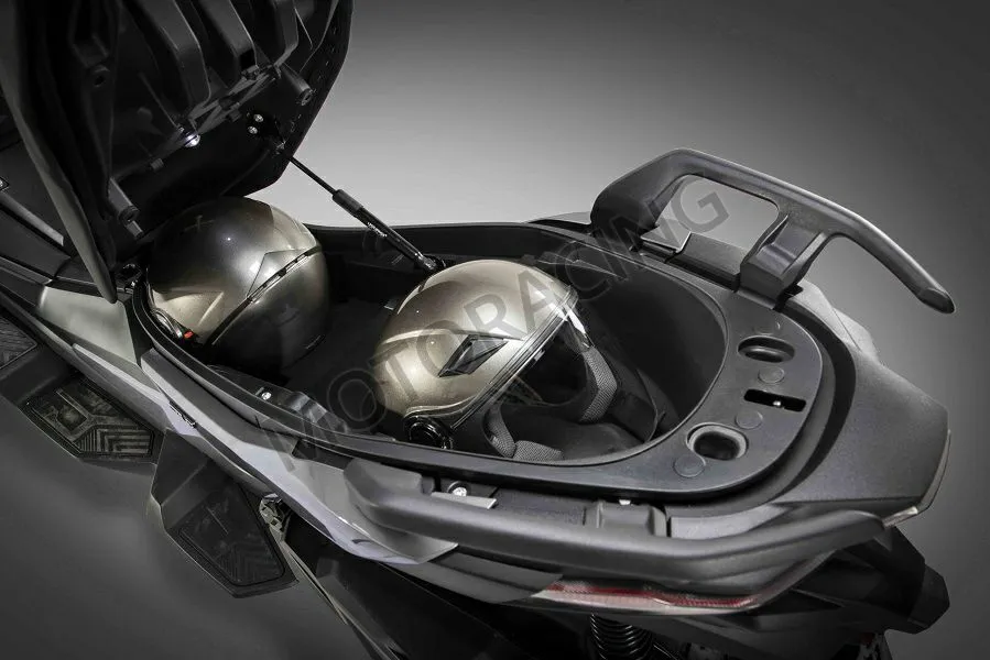 Στον αποθηκευτικό χώρο κάτω από τη σέλα μπορεί να φιλοξενήσει ένα full-face κράνος, κι ένα jet, ενώ υπάρχει φωτισμός LED. Οι χώροι συμπληρώνονται από τα δυο ντουλαπάκια που κλειδώνουν στην ποδιά. Στο αριστερό χωράει ένα μικρό μπουκάλι νερό, ενώ στα δεξιά, ο μικρότερος χώρος εξακολουθεί να σας επιτρέπει να τοποθετήσετε ένα τηλέφωνο (σε ειδική θήκη), τουλάχιστον, που μπορεί να συνδεθεί στη θύρα USB. Σε αυτό το χώρο υπάρχει και μια πρίζα 12V, αλλά και η θύρα της κάρτας mini-SD, για το καταγραφικό της κάμερας που βρίσκεται κάτω από τη ζελατίνα!!
